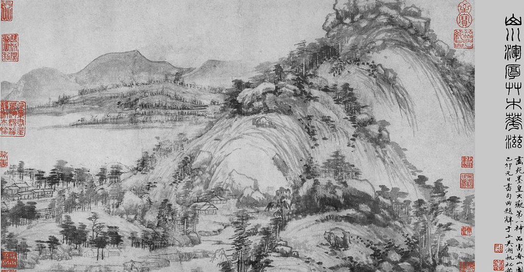 黃公望不愧是「元四大家之首」,這幅他畢生的傑作,就像一首命運交響曲,山巒與群峰跌宕有致,有如他精采起伏的一生,山峰下,茫茫江水,茂林叢生,漁舟、小亭、村舍倘佯其間,一如其淡泊的心境。全卷取法董源、巨然,以披麻皴表現出江南山體渾厚,草木華滋的境界,但比董巨更加簡潔,且利用頓挫轉折,道盡書法之美。董源、巨然的畫,我在故宮也看過,(雖然可能都是後人臨摹之作),但我覺得此畫比之更有「文人」的味道,從畫史來看,董巨皆是宮廷畫師,非文人出身,雖是此一畫法的創造者,但咸認真正集大成開創元以下幾百年文人畫主流者,非黃公望莫屬!