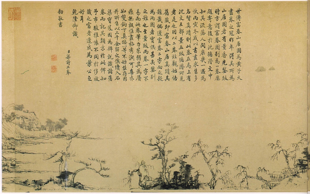 「世傳富春山居圖。為黃子久畫卷之冠。昨年得其所為山居圖者。有董香光鑒跋。時方謂富春圖別為一卷。屢題寄意。後於沈德潛文中。知其流落人間。庶幾一遇為快。丙寅冬。或以書畫求售。多名賢真蹟。則此卷在焉。上有沈文王鄒董五跋。德潛所見者是也。因以二卷竝觀。始悟舊藏。即富春山居真蹟。其題籤偶遺富春二字。向之疑為兩圖者。實悞。甚矣。鑒別之難也。至董跋兩卷一字不易。而此卷筆力苶弱。其偽贗鼎無疑。惟畫格秀潤可喜。亦如雙鈎下真蹟一等。不妨並存。因并所售。以二千金留之。俟續入石渠寶笈。因為辨說。識諸舊卷。而記其顚末於此。俾知予市駿雅懷。不同於侈收藏之富者。適成為葉公之好耳。乾隆御識。臣梁詩正奉勅敬書。」
